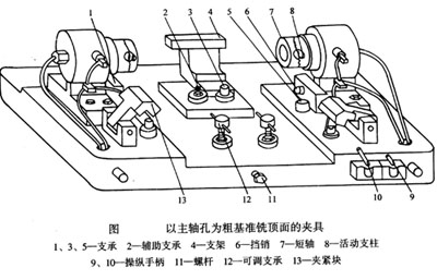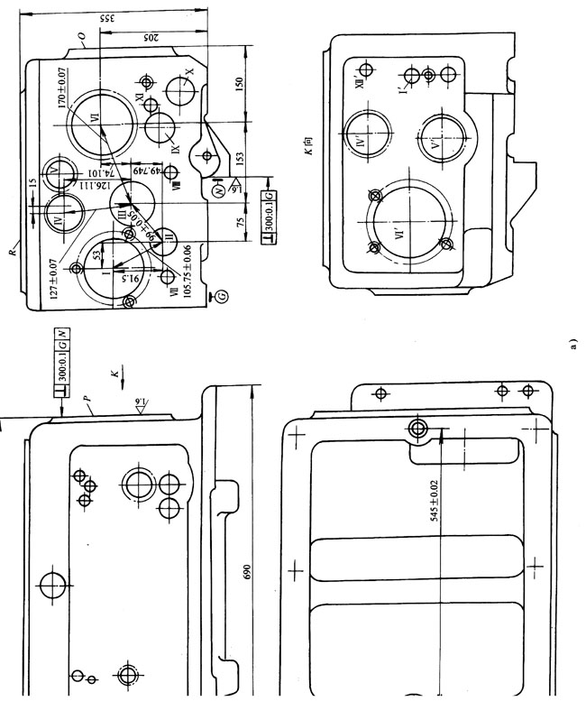 導(dǎo)向支承可以直接固定在夾具體上,夾具剛度好,有利于保證孔系加工的位置精度,且裝卸方便,便于組織生產(chǎn)流水線和實現(xiàn)情動化生產(chǎn),適用于大批大量生產(chǎn)。但這種定位方案也有不足之外,如在加工過程中無法觀察加工情況,無法測量孔徑和調(diào)整刀具,因而要求采用定尺寸刀具直接保證孔的精度,須相應(yīng)提高頂面R至底面M的尺寸加工精度,同時,兩定位銷孔,圖樣上為主軸孔的沒孔,其精度不高,也提高加工精度。