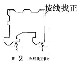 引法是先在毛坯上按照零件圖劃出中心線、對稱線和各等加工表在的加工線,然后將工件裝上機床,按照劃好的線找正工件在要床上的裝夾位置。如圖2所示車床床身毛坯,為保證床身各種壁厚均勻及各加工面的加工余量,先在平臺上將毛坯按圖劃好加工線,然后在龍門刨床工作臺上用千斤頂支起床身毛坯,用劃線盤按線的正后夾緊,再對床身毛坯底平面進(jìn)行粗刨。這種裝夾方法生產(chǎn)率低,精底低,且對工人技術(shù)水平要求高,一般用于單件小批生產(chǎn)中加工復(fù)雜而笨重的零件,或毛坯尺寸公差大而無法直接用來具裝夾的場合。