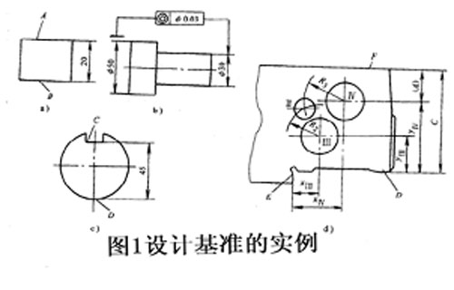 零件圖上可以確定零件上某些點(diǎn)、線、面位置所依據(jù)的點(diǎn)線、面。如圖1中,圖a所示零件,對尺寸20mm而言,A、B面互為設(shè)計基準(zhǔn);圖b所示零件,φ50mm圓柱面的設(shè)計基準(zhǔn)是φ50mm的軸線,φ30mm圓柱面的設(shè)計基準(zhǔn)是φ30mm的軸線,就同軸度而言,φ50mm的軸線是φ30mm軸線的設(shè)計基準(zhǔn);圖2-24c所示零件,圓柱頊下素線D是槽底面C的設(shè)計基準(zhǔn)。圖d所示主軸箱臬體,頂面F的設(shè)計基準(zhǔn)是底面D,孔Ⅱ軸線的設(shè)計基準(zhǔn)是孔Ⅲ和Ⅳ軸線。