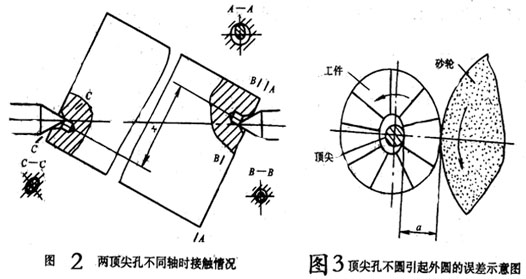 (2)兩端頂類孔的同軸度誤差 兩端頂尖孔沒軸,造成頂尖與頂尖孔接觸不良的情況,加工時出現(xiàn)圓度及位置誤差。圖2所示兩端頂尖孔因兩端不同軸形成接觸不良的情況。