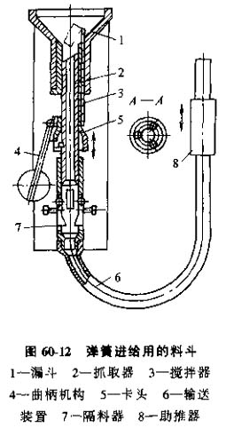 圖60-12中帶往復(fù)移動(dòng)管的料斗,包括做成漏斗樣的容器1.在其下部敷設(shè)有帶攪拌器3的中心管式抓取器2.由曲柄機(jī)構(gòu)4借助球形卡頭5完成抓取動(dòng)作。中心往復(fù)移動(dòng)管道和輸送裝置6聯(lián)接。在6中設(shè)置隔料器7和助推器8.。彈簧從漏斗1落入中心往復(fù)管道,當(dāng)輸送裝置填滿時(shí),借助于由曲柄機(jī)構(gòu)獲得運(yùn)動(dòng)的球形離合器,強(qiáng)制地將彈簧推入運(yùn)輸裝置并用隔離器7以上一定壓力攔住,當(dāng)運(yùn)輸裝置中出現(xiàn)附加反作用力時(shí),隔料器7能使球形卡頭5以適當(dāng)?shù)牧A緊運(yùn)輸裝置中只有變形而無(wú)缺陷的彈簧。當(dāng)球形卡頭5運(yùn)輸?shù)缴厦嫖恢脮r(shí),處于隔料器上面的釋放彈簧伸直并彈回,從而實(shí)現(xiàn)附加的攪動(dòng)。主要的攪動(dòng)由攪拌器3借助于球形卡頭的5的往復(fù)運(yùn)動(dòng)來(lái)進(jìn)行。因此,在出現(xiàn)附加阻撓的情況時(shí),料斗自己工作而不損壞彈簧,必要時(shí)可用助推器8將彈簧推向工作位.