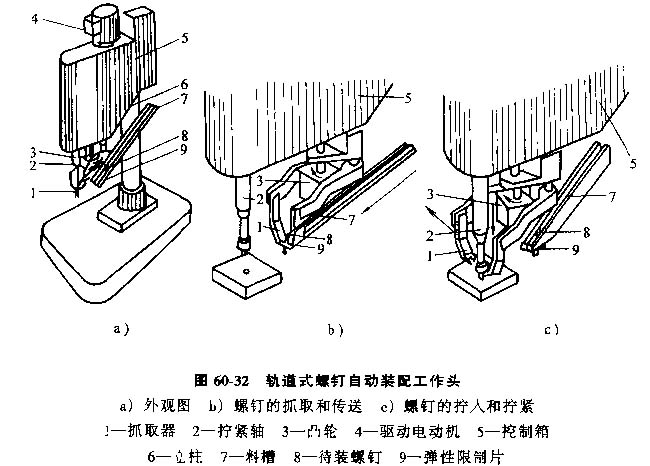 2)軌道式螺紋自動(dòng)裝配工作頭,這種工作頭的待裝螺釘在軌道中運(yùn)動(dòng)。圖60-32為一種能實(shí)現(xiàn)螺釘自動(dòng)傳送、抓取、對(duì)準(zhǔn)、擰入和擰緊等一系列作業(yè)的工作頭。工作頭的工作過(guò)程為: