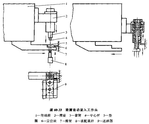 圖60-33為一種墊圈自動(dòng)裝入工作頭。墊圈5作為裝配由送料器9水平送入,呀靠滑架7和中心桿4定位。隨后滑座2下行,中心桿4插入墊圈孔內(nèi)。同時(shí),裝配基準(zhǔn)件8上升與中心桿4結(jié)合。滑架7隨即退回。然后套筒3下行,用機(jī)動(dòng)推入方式完成墊圈5與裝配基準(zhǔn)件8的自動(dòng)裝配作業(yè)。