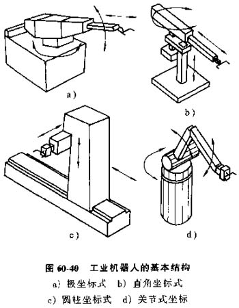 機(jī)器人的基本結(jié)構(gòu)有四種:直角坐標(biāo)、極坐標(biāo),圓柱坐標(biāo)和關(guān)節(jié)式坐標(biāo),見(jiàn)圖60-40。