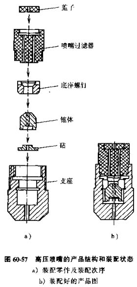 1)產(chǎn)品結(jié)構(gòu)與裝配狀態(tài),裝配圖樣可以提供產(chǎn)品的全貌。如圖60-57所示的高壓噴嘴,圖中各零件都可以逐件沿中心線裝配,因此整個(gè)裝配過程可以在一個(gè)隨行夾具上完成。不需要預(yù)裝配操作。