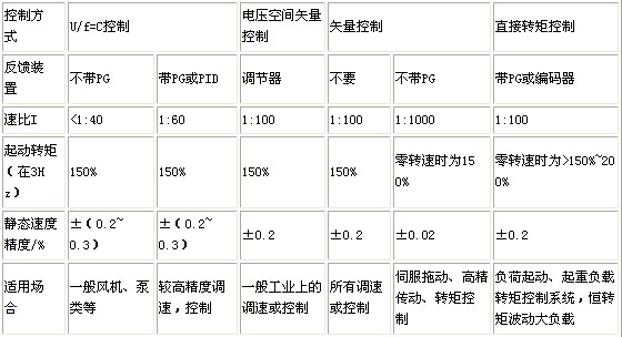 控制方式是決定變頻器使用性能的關鍵所在。目前市場上低壓通用變頻器品牌很多,包括歐、美、日及國產的共約50多種。選用變頻器時不要認為檔次越高越好,而要按負載的特性,以滿足使用要求為準,以便做到量才使用、經濟實惠。表1中所列參數供選用時參考。