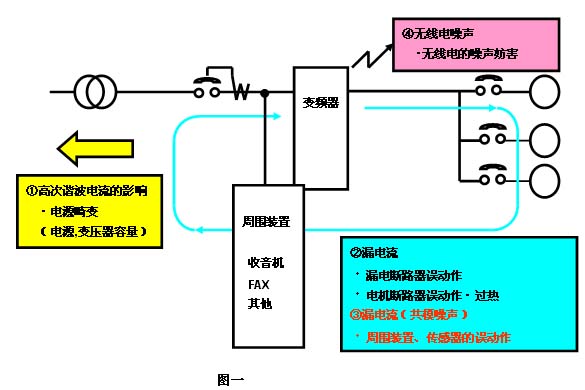 電磁干擾也稱電磁騷擾(EMI),是以外部噪聲和無用信號(hào)在接收中所造成的電磁干擾,通常是通過電路傳導(dǎo)和以場的形式傳播的。變頻器的整流橋?qū)﹄娋W(wǎng)來說是非線性負(fù)載,它所產(chǎn)生的諧波會(huì)對(duì)同一電網(wǎng)的其他電子、電氣設(shè)備產(chǎn)生諧波干擾。如下圖一所示: