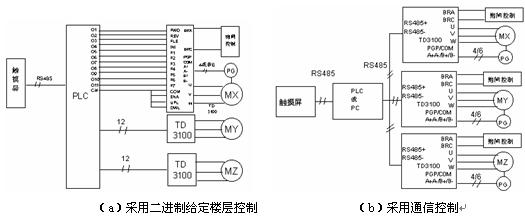 對于立體倉庫、立體車庫這樣需要X、Y、Z三維多點定位運動控制的場合,采用TD3100實現(xiàn),可以大大簡化電路,降低成本,提高可靠性。由于最高層數(shù)可以達(dá)到128層,因此采用給定目的樓層的距離控制,使用異常簡單。采用TD3100立體倉庫的系統(tǒng)如圖4所示,圖中UPL與DWL信號可以使用用戶的平層開關(guān)信號,也可以直接將UPL與DWL與COM短接。FLE為目的層使能端子,當(dāng)其有效時,F1~F7的給定層信號有效;INI為當(dāng)前層初始化端子,其有效時,恢復(fù)當(dāng)前層為F1~F7的給定層。從圖中對比可以看出,采用通信控制,線路簡單,節(jié)省資源,節(jié)省成本。需要注意一點的是,目前該功能需要非標(biāo)定制。當(dāng)然該系統(tǒng)在應(yīng)用前還需要進(jìn)行層高自學(xué)習(xí),自學(xué)習(xí)方法同上節(jié)描述,只需要將總層數(shù)F7.00按照實際情況設(shè)定即可。