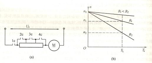 當(dāng)負(fù)載一定時(shí),隨著串入的外接電阻Rw的增大,電樞回路總電阻R=(Ra+Rw)增大,電動(dòng)機(jī)轉(zhuǎn)速就降低。其機(jī)械特性如圖1(b)所示。Rw的改變可用接觸器或主令開關(guān)切換來實(shí)現(xiàn)。