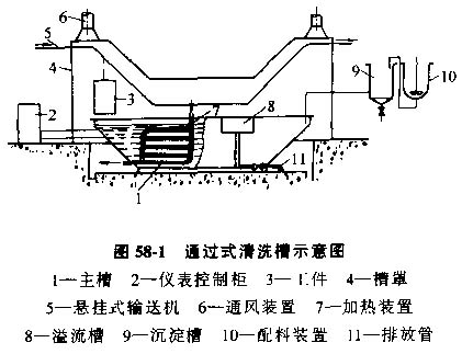 為了提高清洗作業(yè)的勞動(dòng)生產(chǎn)率?梢圆捎美鐖D58-1所示的帶有傳送機(jī),根據(jù)工件的質(zhì)量大小選擇適當(dāng)?shù)膫魉脱b置,如地面式傳送小車(chē)或履帶式傳送機(jī)等等。對(duì)于大型工件,一般采用進(jìn)、出清洗槽。