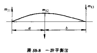 3)進(jìn)行撓性轉(zhuǎn)子一階振型的高速動平衡,見圖58-8。取平衡轉(zhuǎn)速為第一臨界轉(zhuǎn)速的0.9或1.1倍及三個平衡校正面。在中間的平衡校正面中加上平衡質(zhì)量-m12,兩邊的平衡校正面中分別加上m11、 m13,滿足m12=+ m11= m13和m11×a =m13×b使平衡質(zhì)量的合力和合力矩均零。