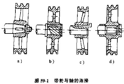 帶輪孔與軸一般采用過渡配合(H7/K6),有少量過盈,對同軸度要求較高。為了傳遞較大的轉矩,需用鍵和緊固件進行周向,軸向固定,圖59-1所示為帶輪在軸上的集中固定方式。