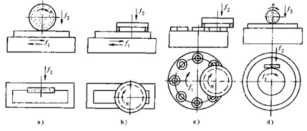 平面磨床用于摸小各種零件的平面。平面磨床的砂輪主軸有臥軸和立軸之分,安裝工件的工作臺有矩形工作臺兩種。根據(jù)砂輪主軸位置和工作臺形狀的不同,普通平面磨床主要有臥軸矩臺平面磨床、立軸矩態(tài)平面磨床、立軸圓臺平面磨床、臥軸圓臺平面磨床四種類型(見圖)