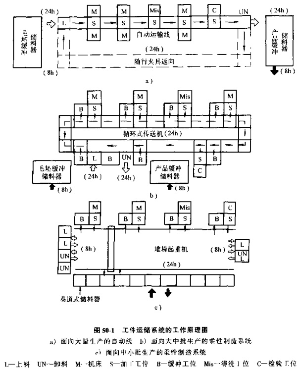 圖50-1a所示的是面向大批量生產的自動線工件自動運輸系統(tǒng),毛坯逐漸或成批從毛坯緩沖儲料器中取出,在自動線前端上料共位上料并存儲,輸送裝置以一定的生產節(jié)拍將工件從前一工位依次向后一工位運送,加工后的成品在自動線后端儲存或卸下進入產品緩沖儲存器,設立毛坯和產品緩沖儲存器的木器是為了緩沖生產中供與求之間的矛盾,因為毛坯的 供應和產品的輸出都是在白天8h內集中進行,而制造系統(tǒng)的生產是24h連續(xù)不斷地進行,所以緩沖儲存量至少應當為制造系統(tǒng)一天的生產量。為了使自動線的上料、卸料工作實現(xiàn)自動化,自動線前端應設置料倉(或料區(qū))由工人定時集中上料;后端設置成品庫,由工人定時將裝滿成品的成品庫移開,并換上新庫,為了使自動線的剛性聯(lián)接具有柔性,往往還設置中間倉庫。