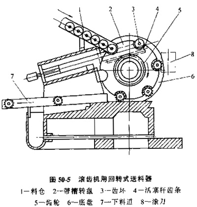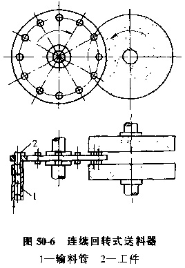 A.回轉(zhuǎn)式送料器,圖50-5是滾齒機(jī)上用的回轉(zhuǎn)式送料器,當(dāng)帶狗槽的轉(zhuǎn)盤旋轉(zhuǎn)時(shí),槽口順次經(jīng)過料倉的靠口處,單個(gè)工件落入槽口。轉(zhuǎn)盤外圓柱面為工件止動(dòng)面兼隔料作用。隨著轉(zhuǎn)盤的間歇轉(zhuǎn)動(dòng),坯料被送到加工工位,加工完的工件被送至下料道。