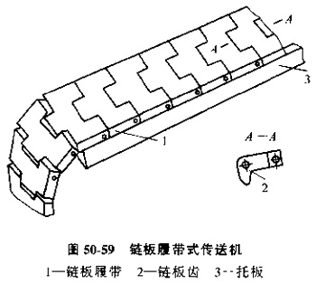鏈板履帶式傳送機(jī)是采用一節(jié)節(jié)帶齒的鏈板組成的,鏈板表面磨光,靠摩擦力傳送工件,見圖50-59。