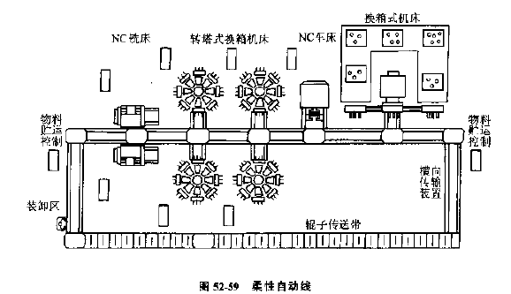 圖52-59所示為由雙面銑床和換箱組合加工中心組成的加工箱體零件的柔性自動線示意圖。