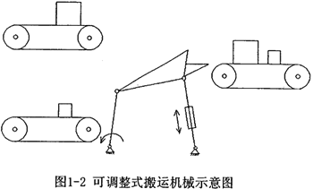 圖1-2所示是一種可調(diào)整曲柄搖桿機(jī)構(gòu)組成的搬運機(jī)械。其中,一個普通電機(jī)驅(qū)動曲柄等速回轉(zhuǎn),在搖桿上還安裝有一個控制電機(jī)。該機(jī)械的工作原理為:右邊的傳送帶上送來的箱子有大有小。要求將大箱子般到左上方的傳送帶上,而將小箱子般到左下方的傳送帶。恰當(dāng)設(shè)計連桿機(jī)構(gòu)的尺度,并利用控制電機(jī)來調(diào)整搖桿的長度,可以分別完成上述任務(wù)。