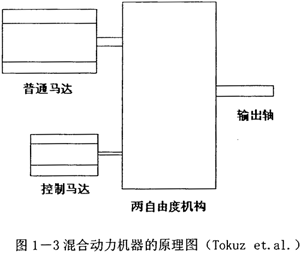 其基本原理如圖1-3所示,一個普通馬達(dá)和一個控制馬達(dá)分別驅(qū)動一個兩自由度機(jī)構(gòu)的兩個輸入構(gòu)件。設(shè)計者期望通過機(jī)械與馬達(dá)的恰當(dāng)配合,使得普通馬達(dá)提供系統(tǒng)所需的主要功率,而控制馬達(dá)僅提供佼小的輔助功率,但還能夠?qū)敵鲞\動進(jìn)行控制;旌蟿恿C(jī)器的研究動機(jī)之一是期望以一個大功率(大扭矩)的普通馬達(dá)、一個小功率(小扭矩)的控制馬達(dá)、以及一個機(jī)構(gòu)的組合系統(tǒng)來替代一個大功率(大扭矩)的控制馬達(dá),從而降低成本;旌蟿恿C(jī)器的研究動機(jī)之二是期望利用機(jī)構(gòu)具有的高機(jī)械利益(與控制馬達(dá)和負(fù)載直接耦合的清形比較而言)來提高運動控制的精度及穩(wěn)定性。