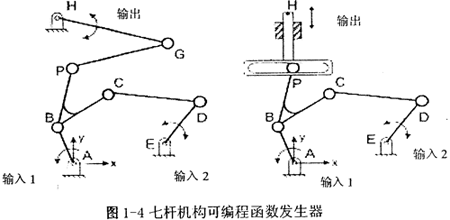 Bhartendu Seth和Sesha Sai Vaddi提出基于混合動力機(jī)器思想的可編程函數(shù)發(fā)生器(Programmable function generators),如圖l-4所示分別為七桿機(jī)構(gòu)的兩種設(shè)計。