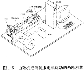 近年來,顏鴻森等人致力于有關(guān)變輸入轉(zhuǎn)速凸輪機(jī)構(gòu)的研究,其具體成果為通過仿真和試驗驗證消除了從動件的運動特性曲線的不連續(xù)性,及降低了各種凸輪曲線(如擺線、多項式曲線等)的從動件和加速度峰值。其實驗系統(tǒng)如圖1-5所示,其中微機(jī)控制的伺服電機(jī)作為變速單元,以直動滾子從動件平面凸輪機(jī)構(gòu)為執(zhí)行機(jī)構(gòu)。