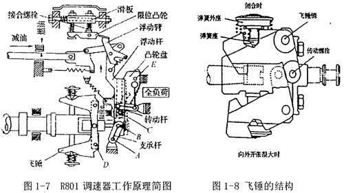 圖1-7為R801調(diào)速器的工作原理簡圖,圖1-8為飛錘結(jié)構(gòu)圖。該調(diào)速器采用特殊的凸輪機(jī)構(gòu)和浮動桿的可變杠桿比(1.1~5.4)進(jìn)行調(diào)速,可獲得多種適應(yīng)特性。在調(diào)速器上部,裝有全負(fù)荷限位機(jī)構(gòu),用于確定限位凸輪的位置。調(diào)整全負(fù)荷限位機(jī)構(gòu),將使滑板左右移動。擰出或擰進(jìn)接合螺栓,可調(diào)整限位凸輪上下移動偏轉(zhuǎn)一微小角度,以此改變限位凸輪型線方程。操縱手柄和轉(zhuǎn)動桿固定在操縱手柄軸上,轉(zhuǎn)動桿帶動導(dǎo)向軸,導(dǎo)向軸的一端沿凸輪盤中滑槽的型線作運動。其另一端帶有一滑塊,滑塊在圓柱形的浮動桿內(nèi)上下移動,以此實現(xiàn)可變杠桿比。如調(diào)節(jié)手柄轉(zhuǎn)到“怠速”位置時,浮動臂不與限位凸輪接觸,此時限位凸輪不起作用。如果發(fā)動機(jī)轉(zhuǎn)速超過設(shè)定的轉(zhuǎn)速,則飛錘更張開,使滑動螺栓左移,B點繞A點逆時針轉(zhuǎn)動,同時浮動桿繞C點按順時針方向轉(zhuǎn)動,拉引調(diào)節(jié)齒桿向“怠速”位置移動,而使發(fā)動機(jī)轉(zhuǎn)速下降。如果怠速時柴油機(jī)轉(zhuǎn)速下降,則會產(chǎn)生與上述相反的過程。