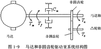 如圖1-9所示的馬達(dá)和非圓齒輪驅(qū)動系統(tǒng),如果沒有加設(shè)一對非圓齒輪,馬達(dá)提供給凸輪軸的是一個恒定的速度(理論上),加了非圓齒輪后,通過非圓齒輪節(jié)線的設(shè)計,為凸輪軸傳遞一個可變的速度輸入函數(shù),從而產(chǎn)生所要求的速度輸出函數(shù)。