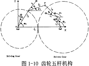 3.設(shè)計空問受約束于拓?fù)浣Y(jié)構(gòu)與構(gòu)件的受力條件。例如,雖然四桿機(jī)構(gòu)最為簡單實用,但是仍有許多性能要求更高的場合不得不采用多桿機(jī)構(gòu)(如圖l-10所示的齒輪五桿機(jī)構(gòu),圖中圓齒輪分別與桿l2·l5固連)。
