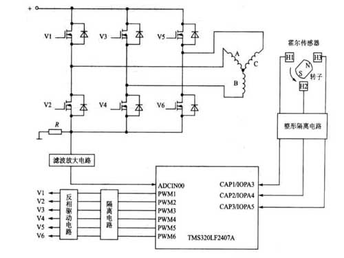 圖2 用TMS320LF2407A實現(xiàn)三相無刷直流電動機(jī)調(diào)速的控制和驅(qū)動