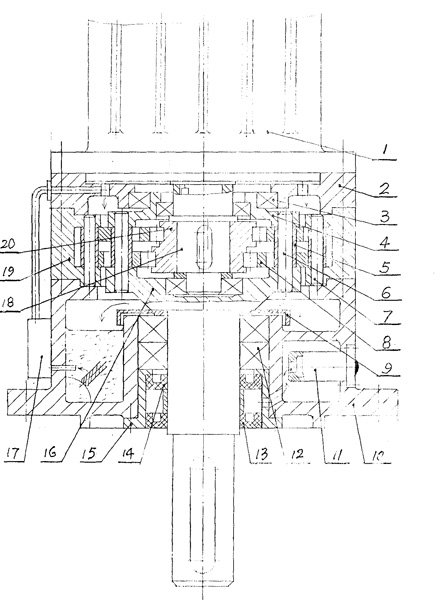 | 一種釜用不泄漏減速機(jī),由擺線輪[8]、輸入軸[18]、偏心軸承[20]、機(jī)座[10]、針齒輪及W輸出機(jī)構(gòu)組成,其中針齒輪由針齒殼[19],均布在針齒殼上的針齒[7]構(gòu)成,W機(jī)構(gòu)由輸出軸[16]與均布在輸出軸圓盤上的柱銷[6]及柱套[5]構(gòu)成,其特征在于: a)機(jī)座[10]內(nèi)有一儲油腔,機(jī)座外壁有一油泵[17]用來將儲油腔的潤滑油泵至減速機(jī)頂端由上而下對機(jī)件進(jìn)行潤滑; b)在輸出軸支承軸承[12]頂端有一圓環(huán)蓋[9],其高度高于儲油面1~3cm,用以防止從沿輸出軸漏油; c)在輸出軸軸承[12]下端有一個密封組件,它由套筒[15]及裝在套筒內(nèi)的密封[13]、[14]構(gòu)成,二密封之間要有一定空間,密封組件用以防止有毒介質(zhì)從反應(yīng)釜中泄漏到減速機(jī)內(nèi)腔。 |