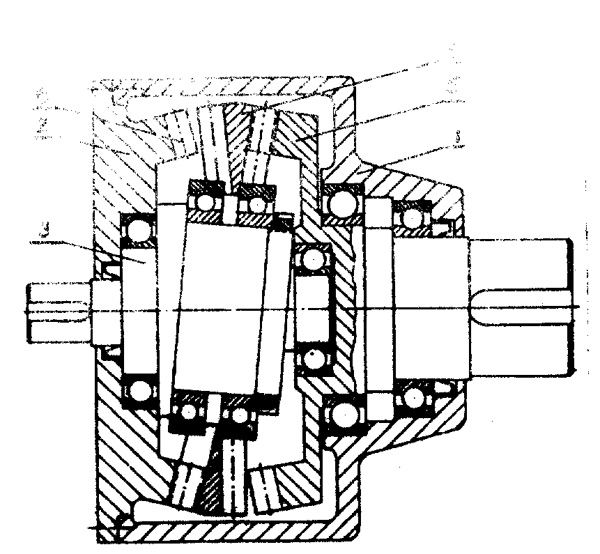 錐齒輪波導(dǎo)減速機,屬于工程機械中采用的大速比減速機,目的在克服以往該類減速機的缺點,使之成為一種能廣泛使用的大速比、大承載能力、較高效率的減速機.其主要特征為:1.波動齒輪用一對滾動軸承架持在輸入軸上.2.所采用的錐齒輪具有多齒嚙合,高強度的特點.3.輸出機構(gòu)為一對同樣齒廓的錐齒輪.用途:本發(fā)明可廣泛用于各種機械之中,尤其適合于工況惡劣,超載嚴(yán)重的煤炭、冶金、礦山、兵器工業(yè)等大功率,大扭矩,大速比場合.