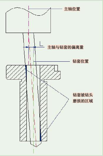 當(dāng)鉆套位置與主軸位置的同軸度較差時,鉆頭刀具加工一段時間以后會導(dǎo)致鉆套進(jìn)、出口處的相對位置的局部磨損。如圖4所示,由于鉆頭刀具與鉆套不同軸,所以鉆頭在進(jìn)入鉆套時就碰到了左邊的孔壁,這樣導(dǎo)致鉆頭的直線度變化。而鉆頭在繼續(xù)進(jìn)給時,由于鉆頭與鉆套的配合間隙,又造成鉆頭在鉆套的出口處碰到鉆套的右邊,這樣加工中不僅僅是加工孔的垂直度不好,使用時間一長還導(dǎo)致鉆套的進(jìn)出口孔壁出現(xiàn)相對的孔壁位置磨損。這種現(xiàn)象開始的時候加工孔還在工藝允許要求范圍之內(nèi),但是時間一久,加工孔的位置度就會出現(xiàn)超差現(xiàn)象,因此,只能采用更換鉆套的方法來滿足加工孔的位置度要求。