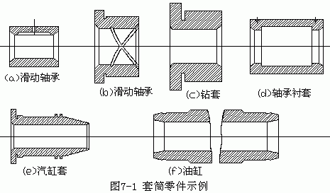 套筒類零件是機(jī)械中常見的一種零件,它的應(yīng)用范圍很廣。如支承旋轉(zhuǎn)軸的各種形式的滑動(dòng)軸承、夾具上引導(dǎo)刀具的導(dǎo)向套、內(nèi)燃機(jī)氣缸套、液壓系統(tǒng)中的液壓缸以及一般用途的套筒,如圖 7 - 1 所示。由于其功用不同,套筒類零件的結(jié)構(gòu)和尺寸有著很大的差別,但其結(jié)構(gòu)上仍有共同點(diǎn),即:零件的主要表面為同軸度要求較高的內(nèi)外圓表面;零件壁的厚度較薄且易變形;零件長度一般大于直徑等。