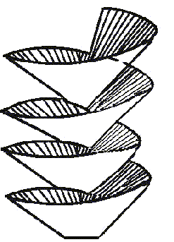 生成原理:麻花鉆刀刃各點切削速度不同。外刃處速度高,切屑流動快,切屑較長。越近中心速度越低,切屑排出越慢,切屑長度越短。這種外刃卷成較大半徑的弧狀,近中心處卷成較小半徑的切屑,如不分斷,就形成螺旋扇面形。這是麻花鉆直線刀刃最常見的切屑。