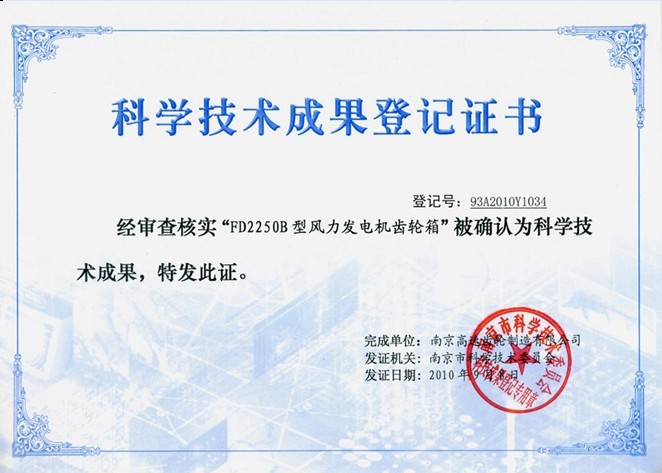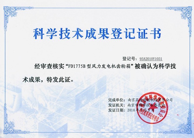 2010年8月26日,在南京高速齒輪制造有限公司(以下簡稱:高速公司)400畝廠區(qū),召開了“ FD1775B、FD2250B型風(fēng)力發(fā)電機(jī)齒輪箱”科技成果鑒定會。會議邀請了南京理工大學(xué)、南京航空航天大學(xué)、東南大學(xué)、南京市江寧區(qū)科技局等單位的專家、領(lǐng)導(dǎo)組成了鑒定委員會。鑒定委員會聽取了高速公司的項目研制工作總結(jié)等報告,審查了相關(guān)技術(shù)文件,考察了生產(chǎn)現(xiàn)場。最終一致認(rèn)為高速公司研制的兩項產(chǎn)品總體技術(shù)水平達(dá)到了國際同類產(chǎn)品先進(jìn)水平,同意通過科技成果鑒定,并希望進(jìn)一步擴(kuò)大國內(nèi)外市場。