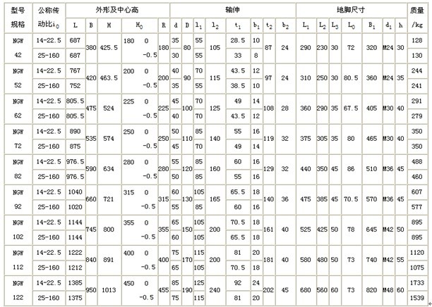 NGW型行星齒輪減速機(jī)主要構(gòu)建有太陽輪、行星輪、內(nèi)齒圈、行星架。 具有一下特點: 1、體積小、重量輕、在相同情況下,比普通漸開線圓柱齒輪減速機(jī)重量輕1/2以上,體積小1/2~1/3。 2、傳動效率高:單級行星齒輪減速機(jī)達(dá)97%~98%;兩級行星齒輪減速機(jī)達(dá)94%~96%;三級行星齒輪減速機(jī)91%~94%。 3、傳動功率范圍大:可以從小于1KW至1300KW,甚至更大。 4、傳動范圍大:i=2.8~2000 5、適應(yīng)性強(qiáng)且耐用。 特點和適用范圍 結(jié)構(gòu)特點 NGW型行星齒輪減速機(jī)主要構(gòu)建有太陽輪、行星輪、內(nèi)齒圈、行星架。 為了使三個行星輪的載荷均勻分配,采用了齒式浮動機(jī)構(gòu),即太陽輪或行星架浮動,或者太陽輪、行星架兩者同時浮動。減速機(jī)中的齒輪為直齒漸開線圓柱齒輪。具有一下特點: 1、體積小、重量輕、在相同情況下,比普通漸開線圓柱齒輪減速機(jī)重量輕1/2以上,體積小1/2~1/3。 2、傳動效率高:單級行星齒輪減速機(jī)達(dá)97%~98%;兩級行星齒輪減速機(jī)達(dá)94%~96%;三級行星齒輪減速機(jī)91%~94%。 3、傳動功率范圍大:可以從小于1KW至1300KW,甚至更大。 4、傳動范圍大:i=2.8~2000 5、適應(yīng)性強(qiáng)且耐用。主要零件均采用優(yōu)質(zhì)合金鋼經(jīng)滲碳淬火或氮化處理,行星齒輪減速機(jī)運(yùn)轉(zhuǎn)平穩(wěn)、噪音小、使用受命10以上。 6、用途和適用條件 NGW型行星齒輪減速器有單級(NGW11—NGW121),兩級(NGW42—NGW122)三級 (NGW73—NGW123)三個臥式系列。主要用于冶金、礦山、起重運(yùn)輸機(jī)械設(shè)備,也可用于其它類似工礦條件下作動力傳動。 高速軸最高速不超過1500r/min 齒輪圓周速度不超過10m/s; 工作環(huán)境溫度為-40℃—45℃; 可正反兩向運(yùn)轉(zhuǎn)。 NGW型行星齒輪減速器的一個重要特點是,內(nèi)嚙合于外嚙合之間共用一個行星輪,NGW就是由“內(nèi)、公、外”三字的漢語拼音的第一個字母組成的。