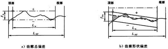 在被測(cè)軸截面上(垂直于基圓柱軸線的截面)齒廓評(píng)定范圍內(nèi),包容實(shí)際齒廓線的兩條最近的理論齒廓線(圖中點(diǎn)劃線)間的距離,在理論齒廓線的法線方向計(jì)值,以Fα表示(見(jiàn)圖3a)。