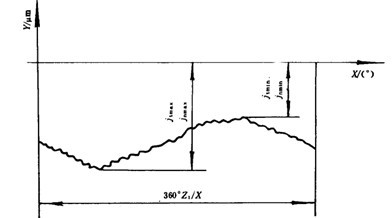 雙嚙法測量的側隙在帶零線的徑向綜合誤差曲線(圖47)上取值。X軸就是零線,X坐標代表大齒輪的回轉角,Y坐標代表側隙。曲線在X坐標360°范圍內,Y坐標的最小負值為jn min(或jt min),最大負值為jn min(或jt min)。