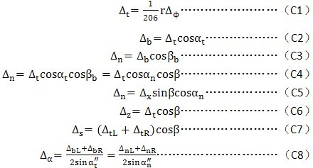 C2齒輪各項誤差應按下述規(guī)定的方向計值:Δfpb、ΔFb、ΔFpX、Δffβ、ΔFw、ΔEwm、jn在齒面法線方向計值;ΔFi′、Δfi′、ΔFp、ΔFpk、Δfpt、ΔFβ、ΔFic′、Δfic′、jt在分度圓切線方向計值;Δff在基圓切線方向計值;ΔFr、ΔFi″、Δfi″、ΔEα″和ΔEH在雙側齒面徑向計值;ΔEs在雙側齒面分度圓螺旋線的法線方向計值。