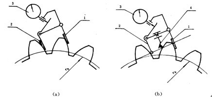 單點法測驗量圓周側隙時的原理參見圖44。單點測量圓周側隙時,在中心距和使用時中心距相同的情況下,將齒輪副的一個齒輪固定,在另一個齒輪的分度圓切線方向上置一百分表然后晃動此齒輪,其晃動量由百分表讀出,即為圓周側隙值。