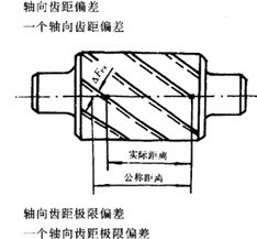 在有效齒寬范圍內(nèi),與齒輪基準(zhǔn)軸線平行面大約通過(guò)凸齒或凹齒中部的一條直線上,任一軸向齒距內(nèi),兩個(gè)同側(cè)齒面間的實(shí)際距離與公稱距離之差。沿齒面法線方向計(jì)值。 |