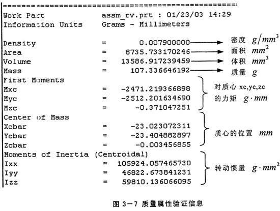 通過(guò)UG強(qiáng)大的質(zhì)量屬性檢驗(yàn)功能,可獲得每個(gè)零件及整個(gè)模型的密度、體積、質(zhì)量和慣量等必要信息。上圖3-7是所獲得的擺線輪的相關(guān)信息。