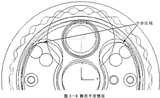 后三種都是實(shí)際結(jié)構(gòu)可能存在的,當(dāng)出現(xiàn)第一種干涉即硬干涉時(shí)就要引起高度重視,這可能是:設(shè)計(jì)存在問(wèn)題,必須及時(shí)糾正。就是借助此功能,造型完成后,本人發(fā)現(xiàn)輸出盤與擺紅、輪間有硬干涉(見圖3-8),與設(shè)計(jì)此減速器的部門交換意見,原來(lái)他們?cè)谠O(shè)計(jì)完后沒(méi)有發(fā)現(xiàn)此問(wèn)題,等制造出成品后才發(fā)現(xiàn),便通過(guò)手工磨削將干涉部分除去。此處也充分體現(xiàn)了與傳統(tǒng)的設(shè)計(jì)方法相比,虛擬樣機(jī)技術(shù)有著不可比擬的優(yōu)越,即在制造第一臺(tái)物理樣機(jī)前就發(fā)現(xiàn)了機(jī)構(gòu)在結(jié)構(gòu)方面的缺陷。至于機(jī)構(gòu)的優(yōu)化和性能改進(jìn)方面,通過(guò)后面的仿真分析更能清楚地展現(xiàn)虛擬樣機(jī)技術(shù)的優(yōu)越。