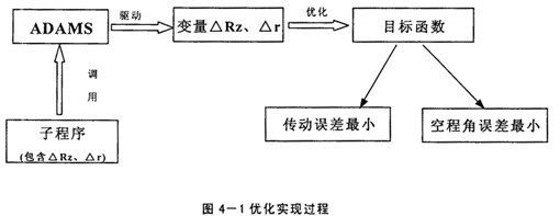 上已述及,擺線輪修形方式及修形量的選擇對RV減速器傳動誤差及空程角誤差的影響很大,因此進行優(yōu)化分析應(yīng)將傳動誤差及空程角誤差作為目標(biāo)函數(shù),而將移距修形量△Rz及等距修形量△r作為設(shè)計變量,且△Rz與△r的正、負(fù)號表明了修形方式,子程序又是建立擺線輪的通用齒廓方程,通過ADAMS對子程序的調(diào)用,就可得到最優(yōu)的修形組合。具體的實現(xiàn)過程如下圖所示:
