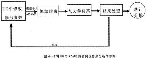 前面已經(jīng)以擺線傳輸線的參數(shù)化建模為例,闡述了UG的強大的基于特征的參數(shù)化造型功能,既然用子程序的方式實現(xiàn)不了,將UG的該功能加以充分利用,也可以實現(xiàn)優(yōu)化修形的目的。實現(xiàn)的途徑是在建造擺線輪的表達(dá)式中考慮修形量△Rz與△r,這樣就建造了修形后的擺線輪,同時△Rz與△r是隨機可調(diào)的變量,可以得到任意組合的修形方式。并且UG的數(shù)據(jù)存儲具有單一數(shù)據(jù)庫的特點,零件圖中修改后,裝配圖及工程圖全都自動更新,不用人工去費時修改。然后,再將總裝配模型導(dǎo)入到ADAMS中施加約束。執(zhí)行仿真。這樣就得到多組修形組合的仿真結(jié)果,經(jīng)過統(tǒng)計分析就可得到最佳的修形組合。具體思路如下圖所示。