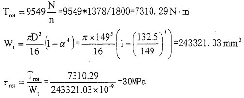 根據(jù)實際情況計算出工作時的剪應(yīng)力:GK2型內(nèi)燃機車啟動發(fā)電機ZQF-38TH,115V,38KW,1170~358Or/min;GK2型內(nèi)燃機機用柴油機型號為MTU16V396TC14,持續(xù)功率為1378KW,旋轉(zhuǎn)角速度為18O0rod/min。柴油機冷區(qū)液溫度為40℃時最小啟動轉(zhuǎn)矩包括加速余量約8OON.m,曲軸扭矩約75ON.m