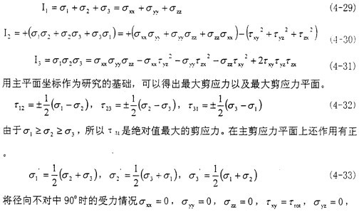 該方程有三個實根,分別為σ1,σ2,σ3,且有σ1≥σ2≥σ3,此三個應(yīng)力即為分別作用于三個相互垂直平面上的主應(yīng)力值,并且在此三個平面上無剪切應(yīng)力。當(dāng)坐標(biāo)變換時,雖然每個應(yīng)力分量都隨之改變,但是有些量是不變的,Il,I2,I3分別為第一,第二,第三應(yīng)力不變量。