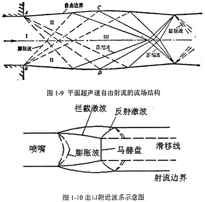 對于圖1-9所示的欠膨脹超聲速自由射流,當(dāng)射擊流從出口射入靜止大氣中的時(shí)候,由于出口截面上的射流的靜壓p1大于環(huán)境壓力pa,在裂尖的邊緣將發(fā)出兩族膨脹波,這兩族膨脹波在中心流線相交,氣體經(jīng)過膨脹波使靜壓由p1降到pa,經(jīng)膨脹波后氣流,其自由邊界向外擴(kuò)張。兩族膨脹波相交之后互相穿過,并保持為膨脹波。這些膨脹波在自由邊界反射回來形成兩族壓縮波,并使氣流邊界向內(nèi)收縮。這兩族壓縮波相互穿過并在自由邊界上反射回膨脹波,這種波的相互與反射現(xiàn)象不斷地進(jìn)行下去,逐漸衰減。
