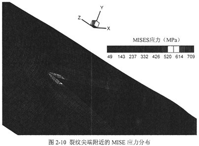 首先觀察裂尖附近的MISES應(yīng)力分布,如圖2-10。按以針狀鐵素體和塊狀鐵素體組織為主的X70鋼級(jí)管線鋼的平均屈服強(qiáng)度500~600MPa估算,計(jì)算給出的裂尖前部塑性區(qū)長(zhǎng)度大約在3個(gè)單元長(zhǎng)度以?xún)?nèi),即0.15m左右。