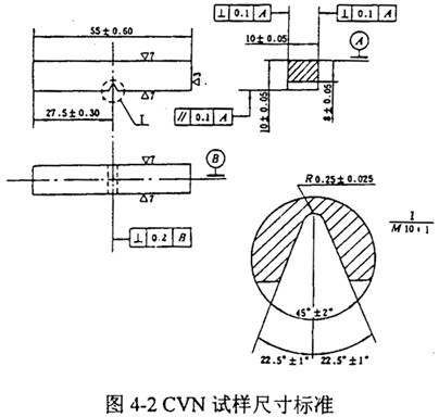 GB2106-80和ASMME23-96規(guī)定試樣標準尺寸為10×10×55mm,缺口深度為2mm。對于2/3尺寸試樣,厚度減為6.67mm,截面尺寸不變,如圖4-2。